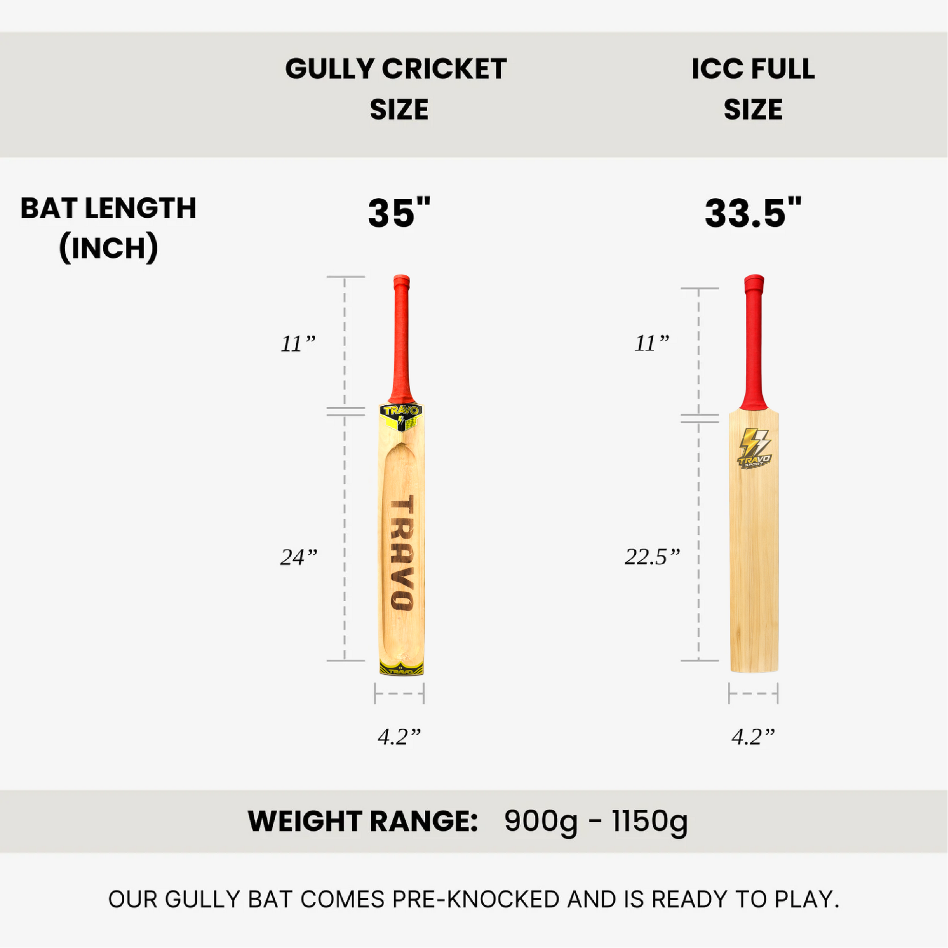 You can choose a bat size depending on your playing style. We have two size variants to choose from. ICC Size (33.5 Inches) and Gully Cricket Size (Slightly longer blade - 35 Inches)
